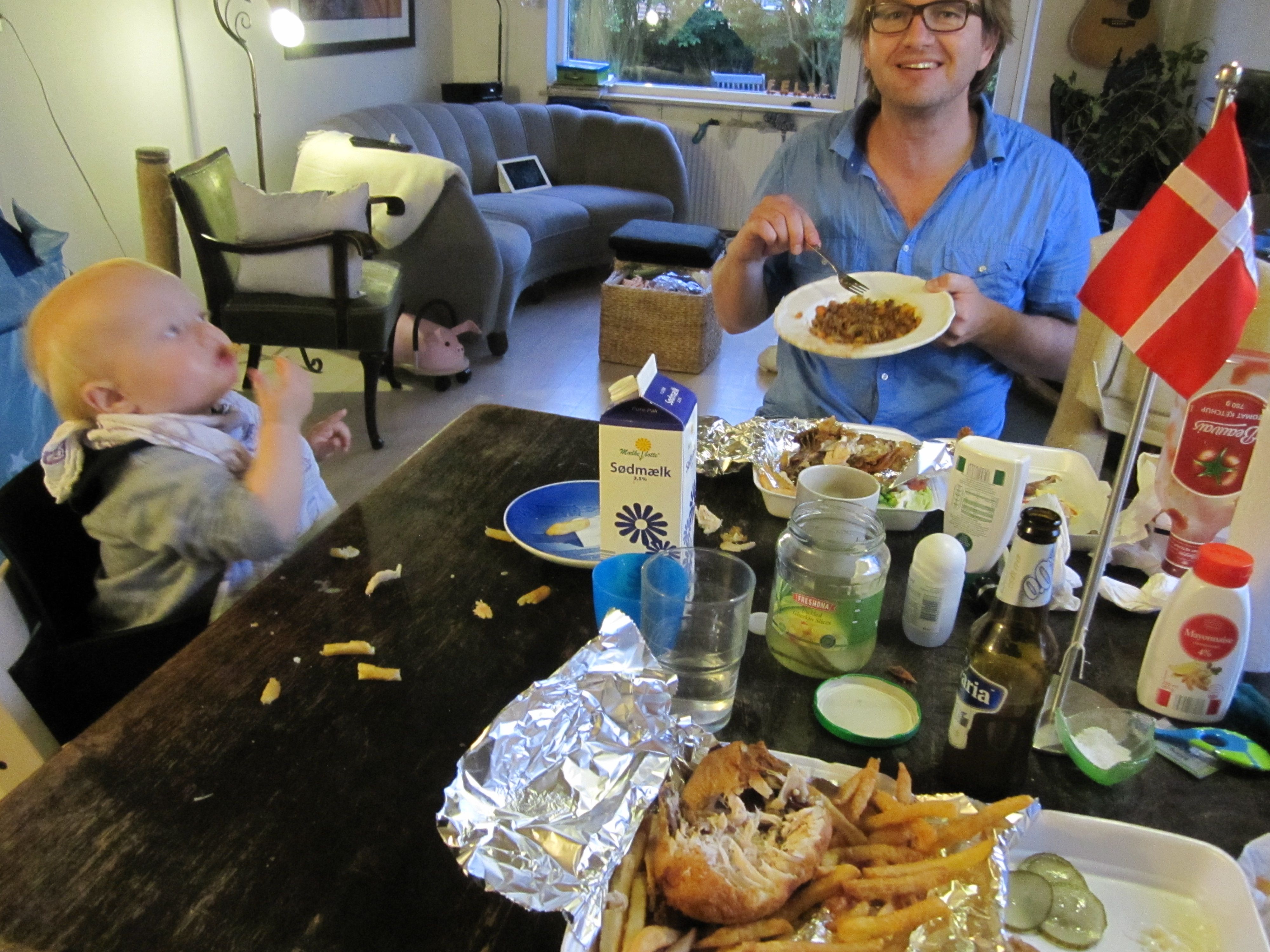 When the money arrived, Mads fell apart in tears, vomit, and diarrhea, but we still found the strength to decorate our table with Danish flags. Rikke cracked open an alcohol-free beer like it was champagne, and then... we did the unthinkable… we ordered TAKE-OUT!