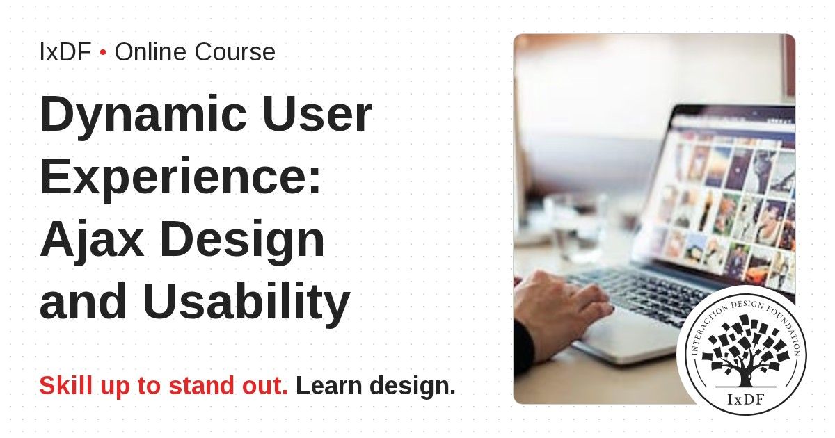 This course will equip you with an understanding of how the use of Ajax (Asynchronous Javascript and XML) can turn a static webpage into a dynamic one. In particular, we will cover how to use Ajax appropriately, so that you can identify areas of a static webpage that the application of dynamic content can improve. At the same time, this course will teach you how to do so without sacrificing usability and accessibility, and hence achieve the optimal user experience. No technical knowledge of Ajax or coding is required, as this course is more focused on the design, rather than implementation, of dynamic web content. Implementation details are hence mentioned only briefly.