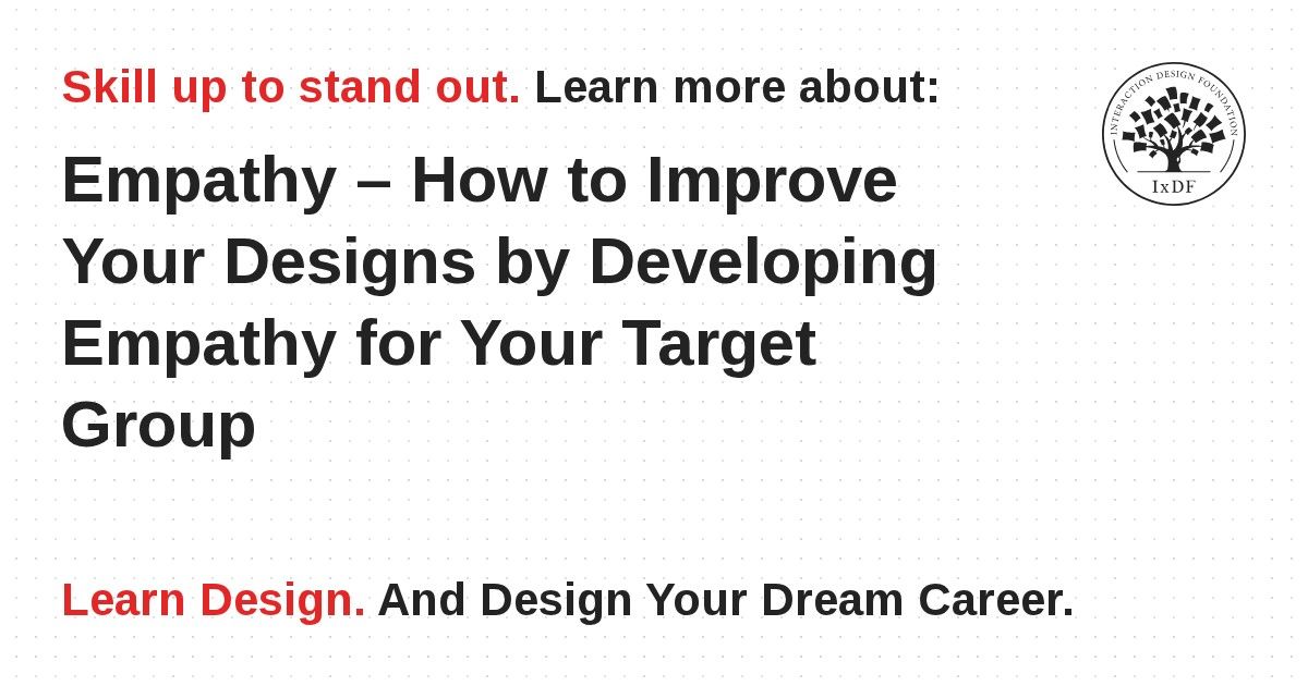 Empathy is the ability to understand and identify with another person’s context, emotions, goals and motivations. In order to design great experiences, successful design firms actively search for empathic insights into their target group. In a design context, empathy serves a distinct purpose: to inspire design decisions in the early stages of the process. At IDEO, for example, the design team is so convinced about the positive effect it has on their projects that they actively advocate it to inspire other designers and innovators. Here, you’ll learn how you can develop empathy for your target group.