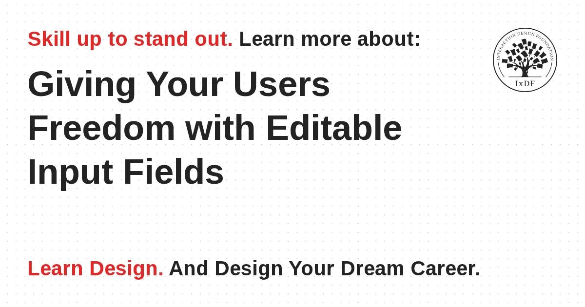 Editable input fields have become a ubiquitous element in graphical user interfaces, so almost every user will be familiar with them and how to interact with them. However, you must make sure you implement these fields in a way that enables users to see that they can enter data into these regions; otherwise, users might overlook them or struggle to see where they must enter their responses. Therefore, editable input fields are an absolute must in many different situations, but improper design can adversely affect the user experience. For instance, anyone who has gone through the process of completing a more involved set of input fields on a screen—be it for a job application, a study questionnaire, or what have you—can attest to the sheer frustration that comes from thinking you’re done, clicking, and then seeing a red exclamation mark at the top that says “You do not seem to have filled out all the fields. Please try again.”