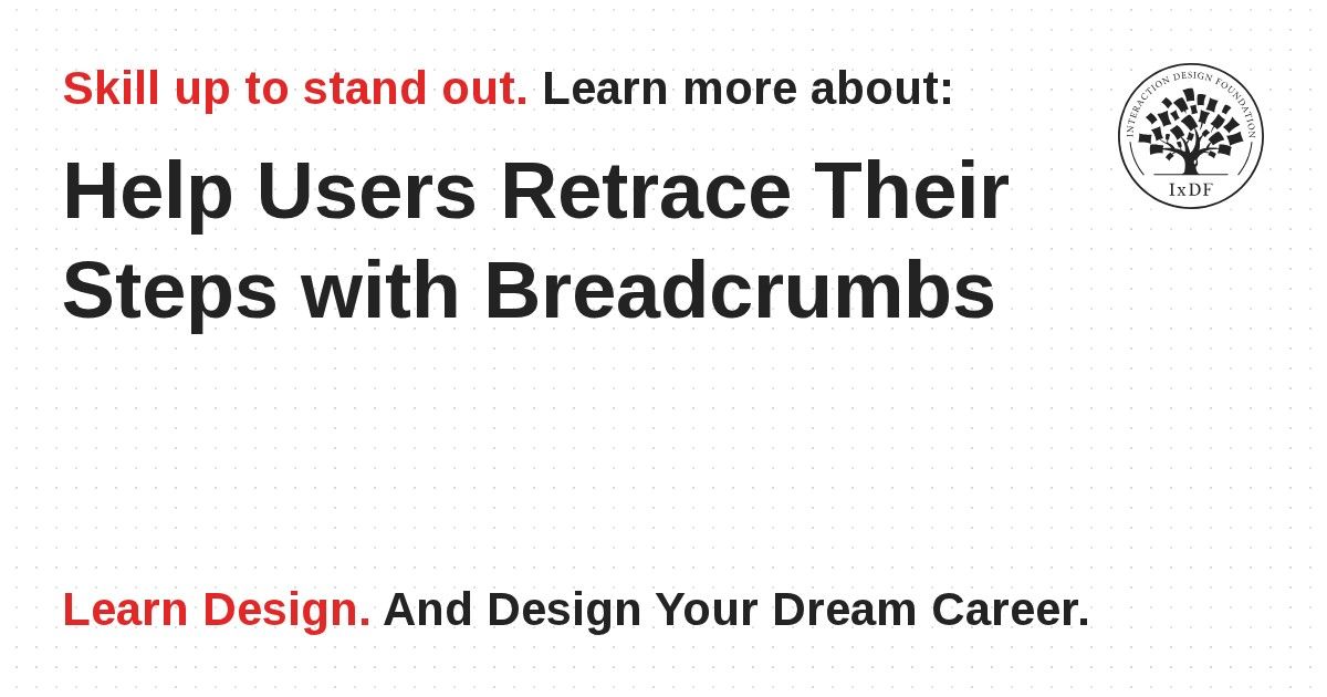 Breadcrumbs can help users to navigate through a hierarchy quickly and effortlessly. Many websites are laced with information about products, services, topics, etc. that, by their very nature, have to be nested within categories and sub-categories. Consequently, breadcrumbs serve as an at-a-glance guide or legend, showing how many removes, or clicks away, a page is from the landing page, for instance. Implementing breadcrumbs is relatively simple, as long as you make sure that labels are clear, unambiguous, visible and located just below the top-level navigation opportunities. Using breadcrumbs affords true freedom of movement and encourages exploration of contents. Combined with other user interface design patterns, they will help you create great user experiences.