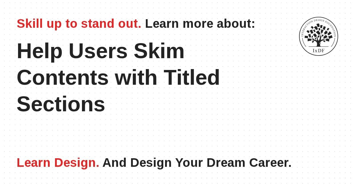 Titled sections help the user skim a page’s contents and identify interesting or useful information. Simply put, they are sections of content that have a title which clearly indicates the subject of that section. Although the solution appears straightforward enough, when implemented with care, its benefits are far-stretching.