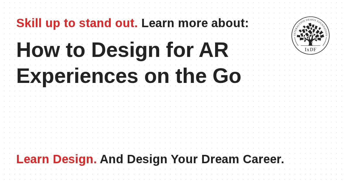 AR is a close cousin of mobile design and should be similarly suited for use on the go. As a designer, it's important to familiarize yourself with the space and go there if possible. Also, ensure your interface is adaptive to the environment, interacts realistically with physical space, doesn't fatigue the user with tasks that require prolonged use, and doesn't overwhelm the user with information and stimuli.