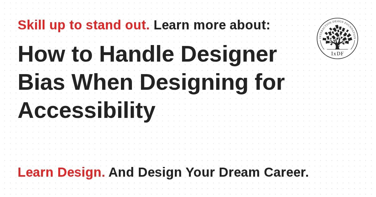 Having a good understanding of your users’ needs and wants is crucial in all design processes. Guessing at user needs is dangerous, since it’s nearly impossible to separate your own experience and point of view from those of your users. This is especially true when designing for accessibility, since a disabled person often has vastly different interaction possibilities from those of a designer. You can try to imagine what it’s like to be a blind person navigating a website and what needs that person would have, but it’s likely that you would miss important aspects. Obviously, user research with the relevant user group is the best way to gain an understanding of your users’ needs; however, if you are not in a position to conduct research, the second-best thing you can do is to be aware of the most common designer biases and to know the most important rules of thumb when creating accessible web designs. In this video, that’s exactly what you will learn!