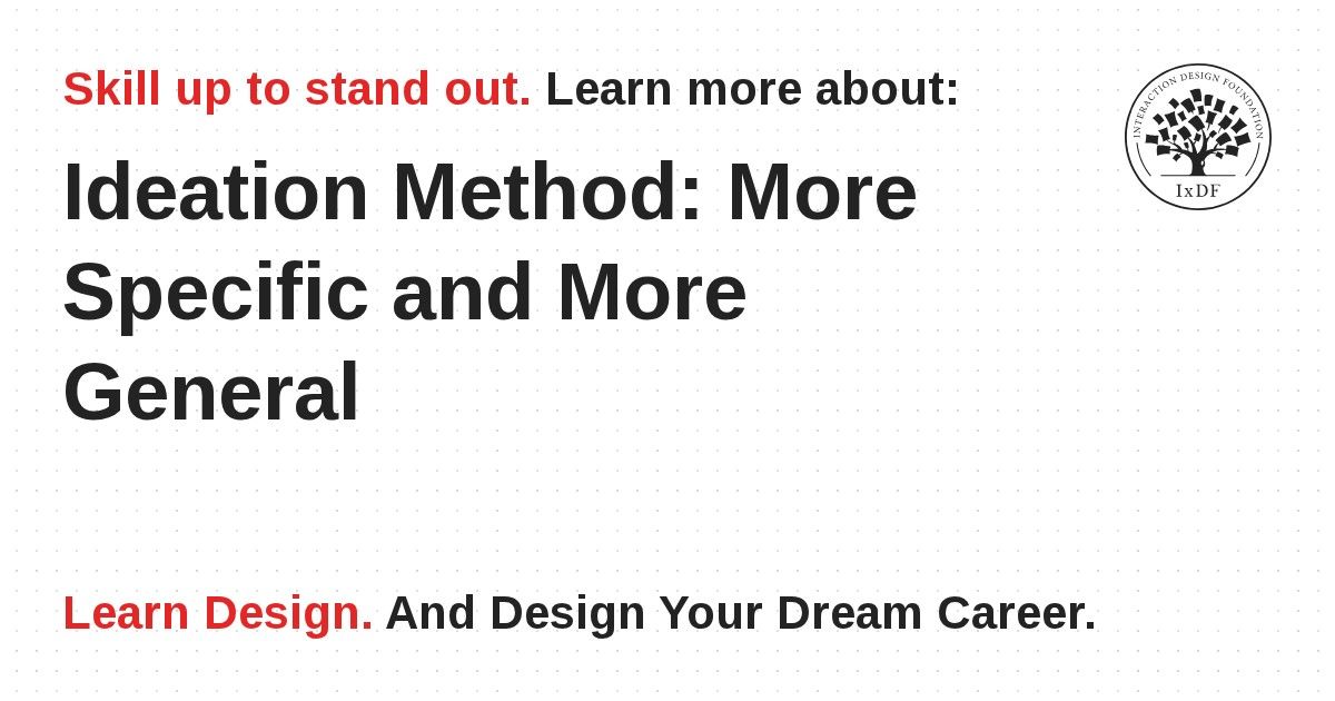 Do you prefer to think abstractly or concretely? It can help you see your problem area from a different perspective if you move between the two types of thinking when you work with ideation and design. In UX design, we often start with quite vague sketches of an abstract idea, but then move to high-fidelity prototypes or detailed scenarios. As with so many dichotomies the real fun―and innovation―is often in the interplay of the specific and the general, the abstract and the concrete. In this video, “Be Specific, Concrete and Physical” as well as in the template below, you’ll learn to ideate in a more specific as well as a more general manner. This will help you take advantage of both abstract and concrete thinking when you ideate for creative projects.