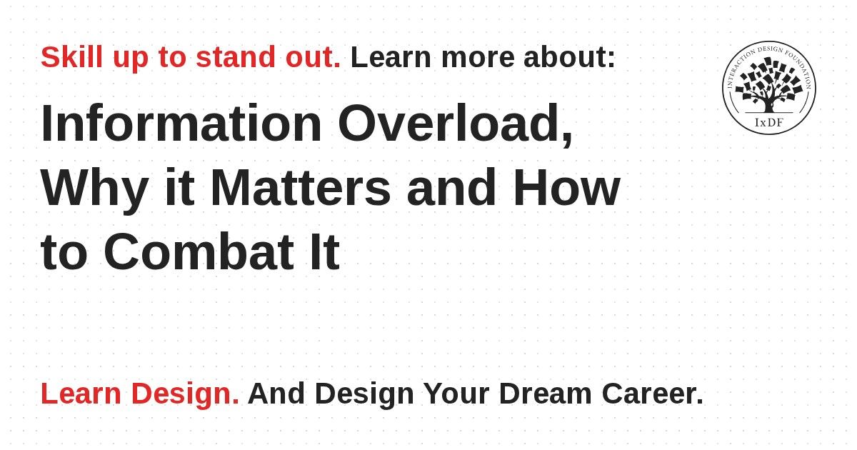 Designers often need to convey information to the users of their designs. Specialists in information visualization design in particular find themselves presenting data over and over again to their users. However, it’s important when developing your designs that you don’t create “information overload” – that is presenting so much data that you leave the user confused and/or unable to make a decision.