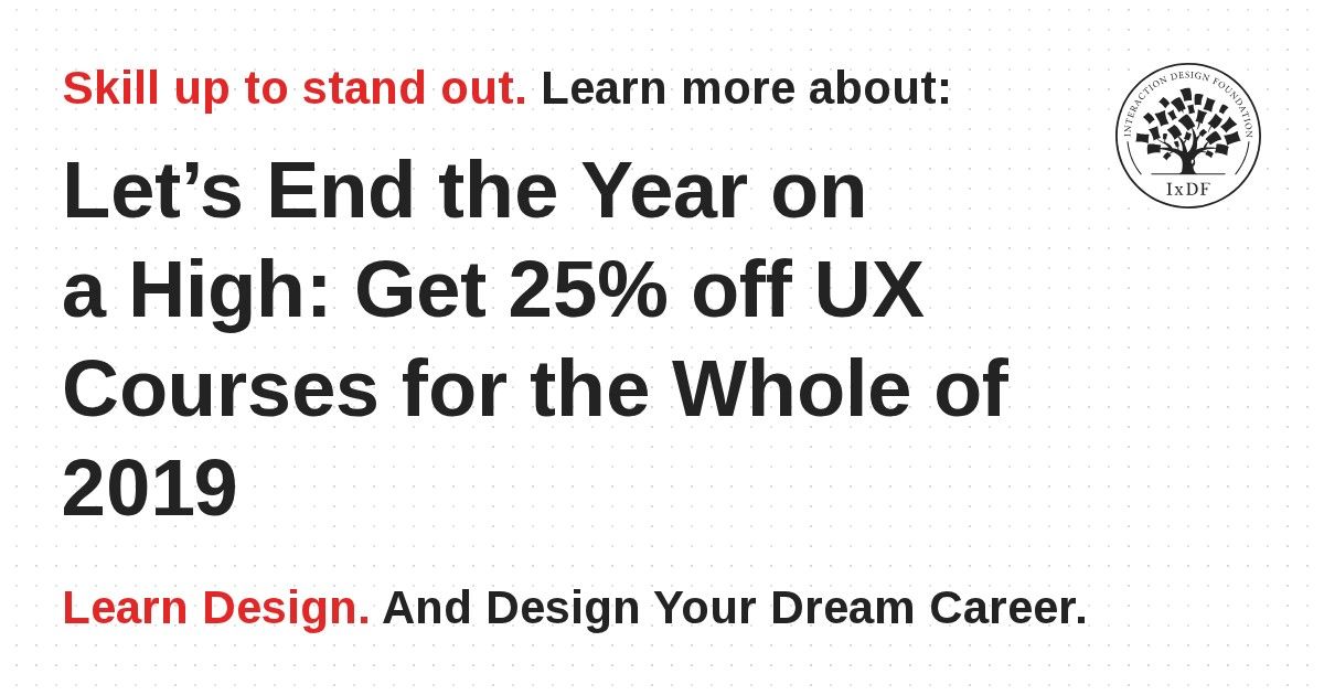 Sign up for IxDF membership before the clock strikes midnight on December 31st and get 25% off access to our full range of 29 online UX design courses. Start 2019 with great design—a brand new year means a brand new chance to get UX right!