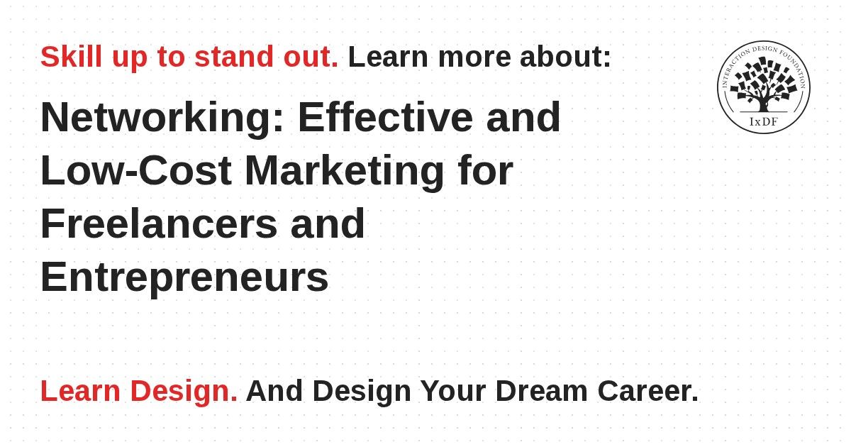 Meetup – Interaction Design Foundation’s Local Groups offers a wide range of local meetings aimed at creative professionals. Here you'll find both potential clients and peers. If there is no IxDF Local Group in your city or area, you should consider initiating it yourself as this will be a great way to meet potential clients, peers, and to establish your name in your area. You can join your Local Group here: /community.