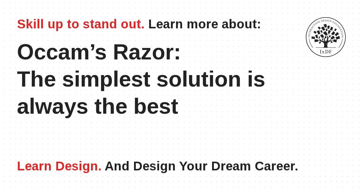 In design, Occam’s Razor encourages us to eliminate unnecessary elements that would decrease a design’s efficiency. So, when two products or designs have the same function, Occam’s Razor recomends selecting the simpler. Therefore, when evaluating your designs, analyze each element and remove as many as possible, without compromising the overall function. This should ensure that you remain with elements you have minimized as much as possible but which still work perfectly