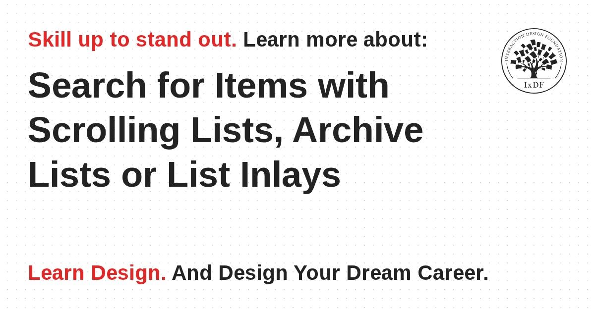 A list is a useful design pattern when you have large amounts of contents to show the user, and he/she needs to select a specific item so as to fulfill a task. Different list patterns exist, and these can be helpful in different situations. The list inlay is especially appropriate when the user needs to zoom in on a specific category of items, without losing sight of the overall categories. Scrolling lists are designed to give access to larger lists without cluttering the page too much. Finally, archive lists are what we specifically use in situations where users search for items based on dates. All lists should contain items that appear clickable, and if users can customize the order of items in a list based on their personal priorities, it will greatly improve their user experience.