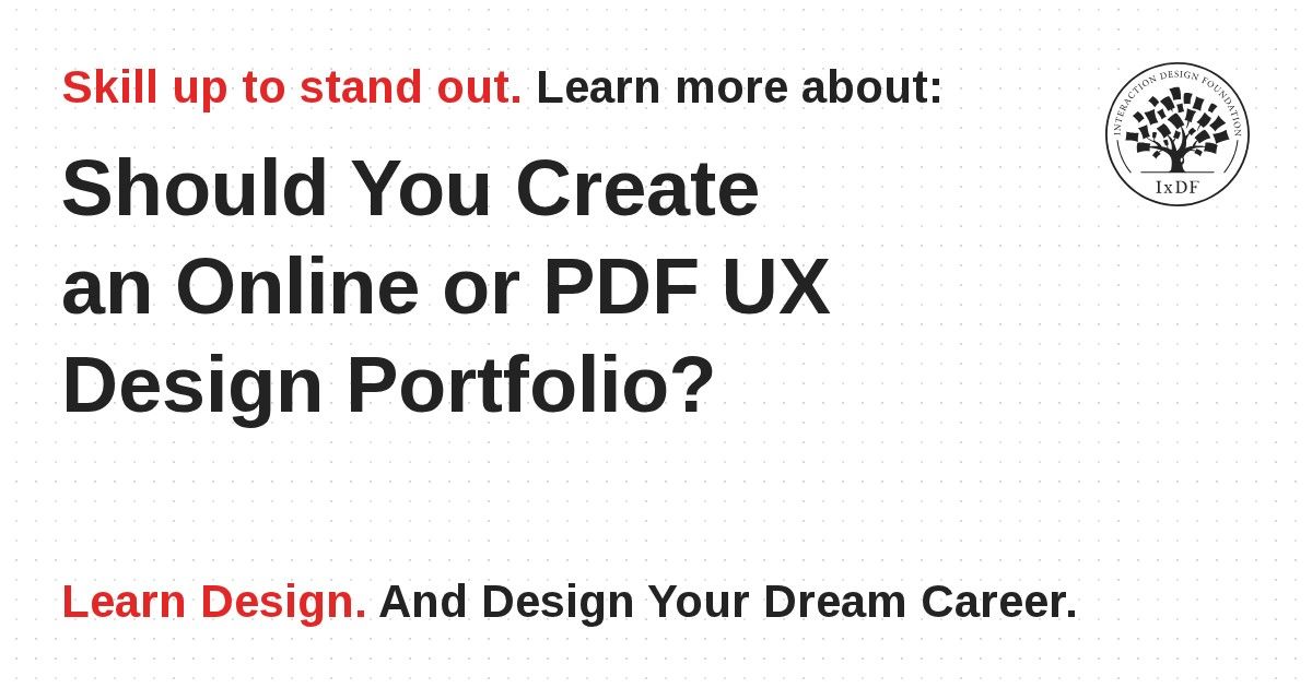 Online and static UX design portfolios serve different purposes; to get the best of both worlds, you should therefore create both an online and a static portfolio. Author / copyright holder: Teo Yu Siang and the Interaction Design Foundation. Copyright license and terms: CC BY-NC-SA 3.0.