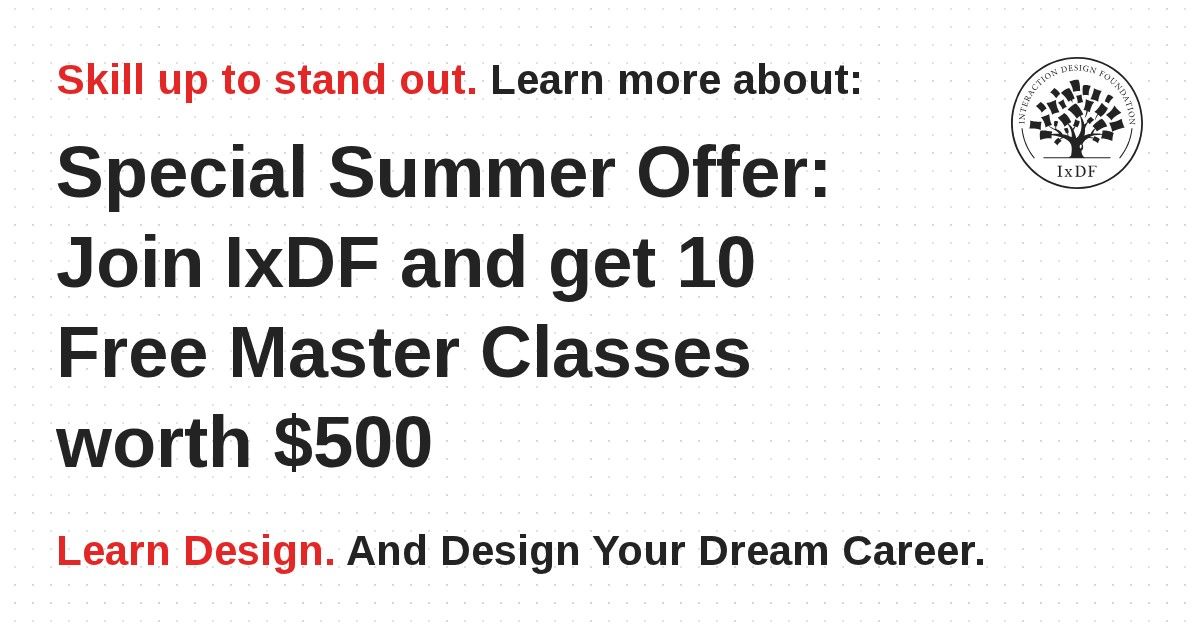 You know about the song of the summer, but what about the deal of the summer? This summer IxDF is giving you the opportunity to learn from 10 industry experts and design leaders for free! Only for the month of August, you can get 10 free Master Classes with a new IxDF membership. That means access to over 30 UX courses and an additional 10 expert-led sessions worth $500.