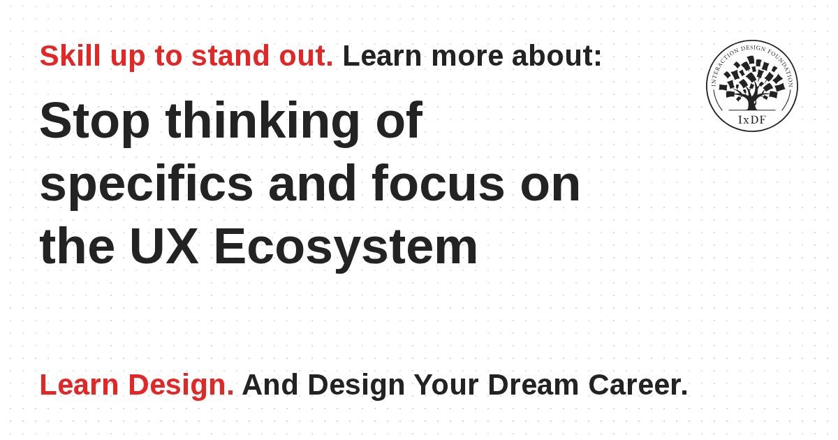 Designers may need to look at the finer details, but ignoring the bigger picture is often more important. Few products are used in isolation and free from the effects of the user's environment or context. Ignoring how a product slots into the user's life, with all of the other devices, tools, websites, products, and other elements competing for their time and attention, can impact on user experience. Designers must think in terms of UX ecosystems, or how comfortably their product sits into the 'world' in which the user is operating.