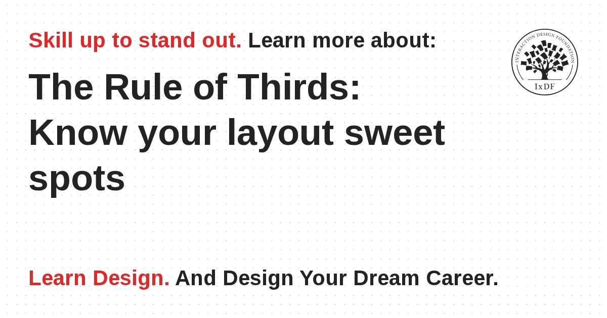The Rule of Thirds has been helping artists and designers for at least over 200 years. It is a universal concept that artists and designers use by creating a grid of nine boxes in order to draw the user’s eye to specific areas on the design. Made by measuring, marking and drawing two sets of vertical and horizontal parallel lines that intersect at four points, this grid gives you the ability to consider your designs in a different way. These intersecting focal points are called “sweet spots”.