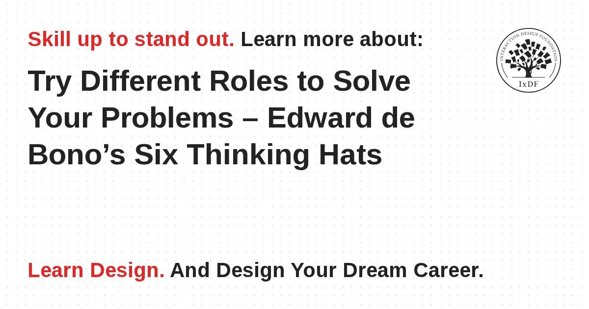 Do you always end up being the person who sees the downside in other people's suggestions? Or perhaps you’re the one who has lots of ideas, and then must suffer when they are dissected and rehashed? In this video, you’ll learn how to use Edward de Bono’s six thinking hats method to try out different roles to see new perspectives in problem solving and creativity. The effect of taking on a role can be quite dramatic, in that you literally become a different person. It’s also powerful in the way that it will help you become aware of the roles you and your colleagues usually play.