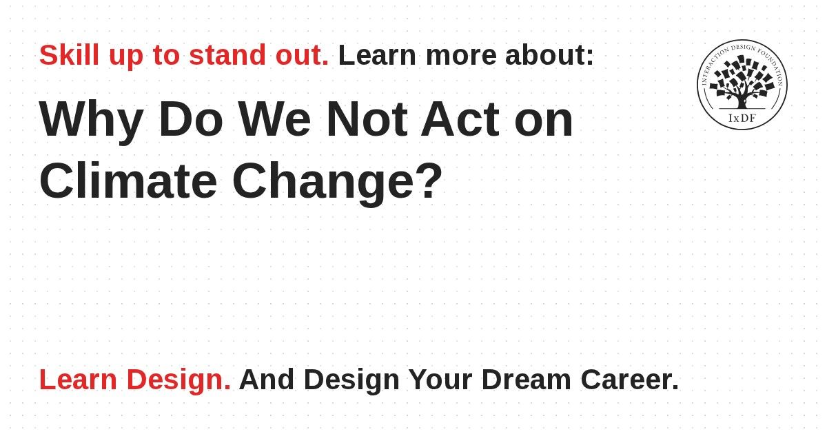 Why do we struggle to act on climate change? In this video, Father of UX design, Don Norman, sheds light on the key reasons behind our inaction. Don will explain why we humans react more effectively to immediate threats and why we often don’t understand and address longer-term, slower-moving, complex problems that don't have immediate, visible symptoms. Don will also investigate why successful and powerful companies are reluctant to change.