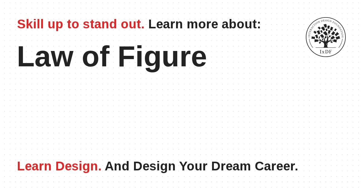 The law of figure-ground is a visual perception law or Gestalt principle. It describes how humans perceive an image as they separate it into the figure—foreground—and ground—background. Designers use it to create a clear visual hierarchy between the front “figure” and surrounding “ground,” and so guide users’ attention to important design elements.