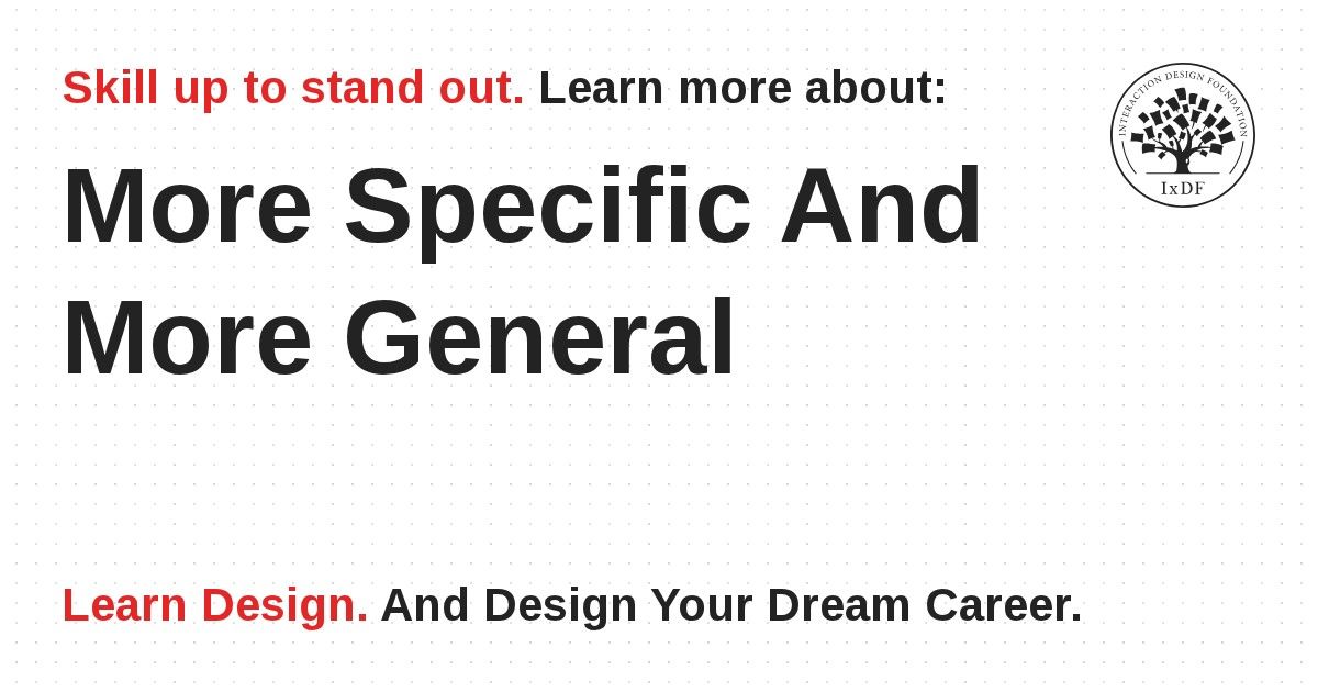 More specific and more general is a creative ideation method which designers use to get new perspectives on projects. By shifting their view from an abstract, general concept to a more specific item—with constraints to define it—and vice versa, they can gain vital insights to consider their design problems in new ways.