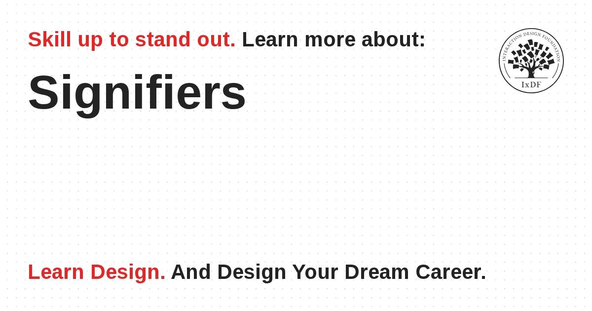 If you have ever studied semiotics (i.e., the study of signs and symbols), linguistics or film, you may have come across signifiers before. Generally speaking, a signifier is something that points to or indicates something else. In the 2013 edition of his book The Design of Everyday Things, Don Norman introduced the term to the field of design, and used it to refer to perceivable cues about the affordances — the actions that are possible for a person to take — with a designed object.