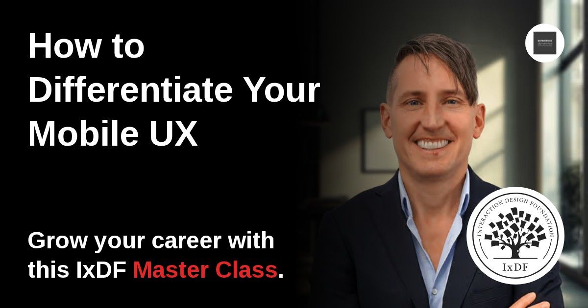 Whether you develop, design, or strategize about mobile UX, this Master Class will give you new insights into the importance of differentiating for mobile. Differentiation is critical for mobile because, without it, users may skip your app or expect to uninstall it from the start. Instead, giving them a mobile experience they can’t live without should be your goal for mobile UX design.