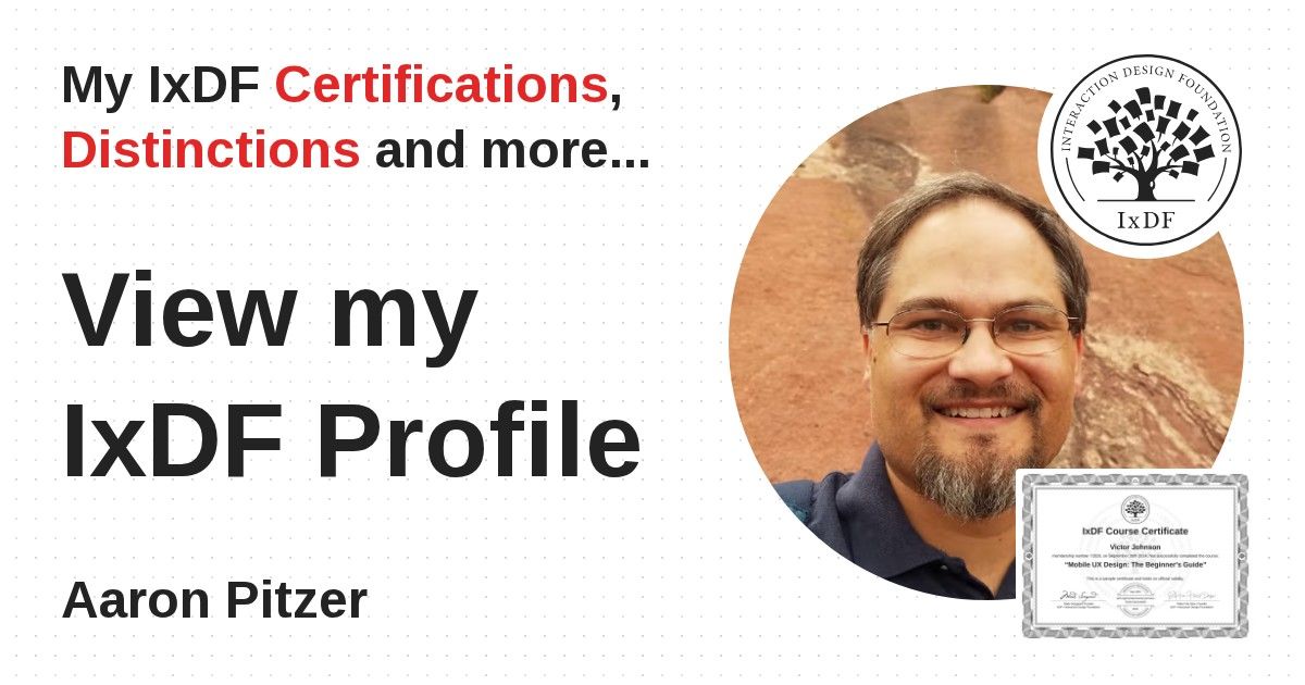 IxDF Course Certificates are awarded to Aaron Pitzer in formal recognition of their coursework surpassing the rigorous benchmarks of exceptional performance established by the IxDF Educational Codex.