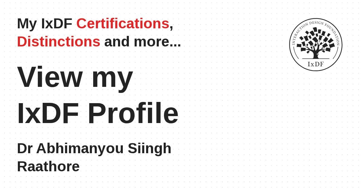 IxDF Course Certificates are awarded to Dr Abhimanyou Siingh Raathore in formal recognition of their coursework surpassing the rigorous benchmarks of exceptional performance established by the IxDF Educational Codex.