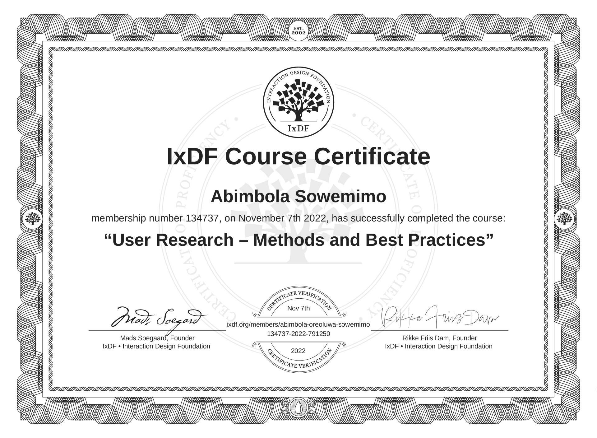 The IxDF Course Certificate (ID #99a87b5c-d875-4bd9-90cf-261464eb356f) above is awarded to Abimbola Sowemimo in formal recognition of their coursework surpassing the rigorous benchmarks of exceptional performance established by the IxDF Educational Codex. View Course Curriculum.
