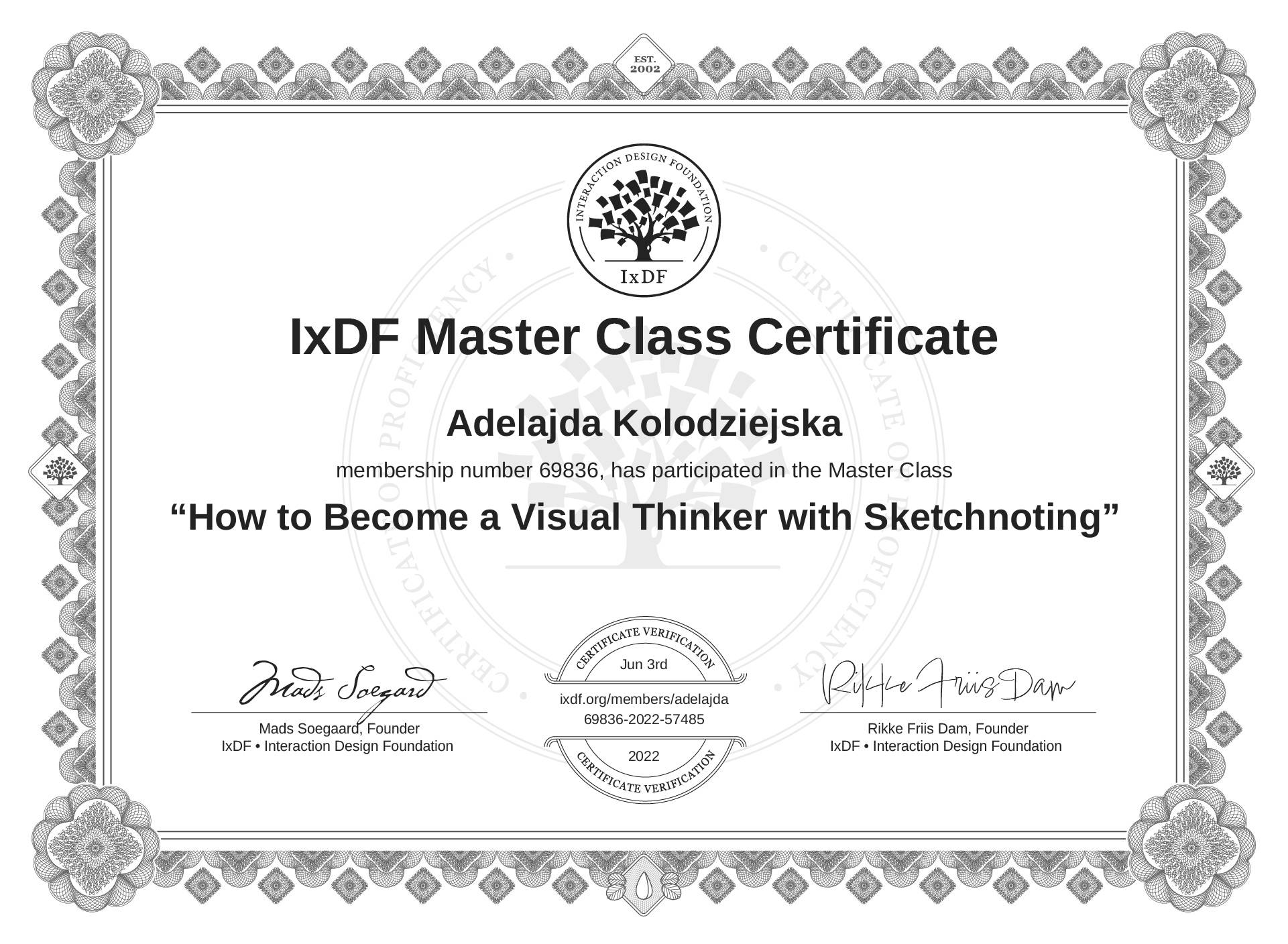IxDF Master Class Certificate awarded to Adelajda Kolodziejska for attending the "How to Become a Visual Thinker with Sketchnoting" Master Class