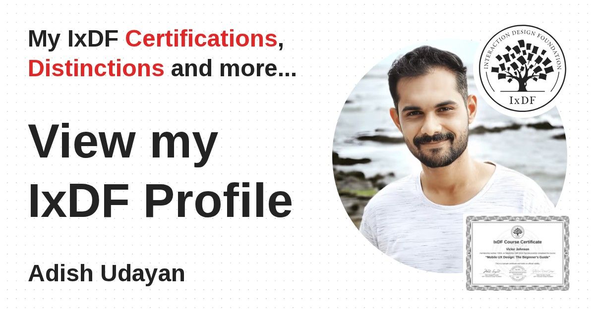IxDF Course Certificates are awarded to Adish Udayan in formal recognition of their coursework surpassing the rigorous benchmarks of exceptional performance established by the IxDF Educational Codex.
