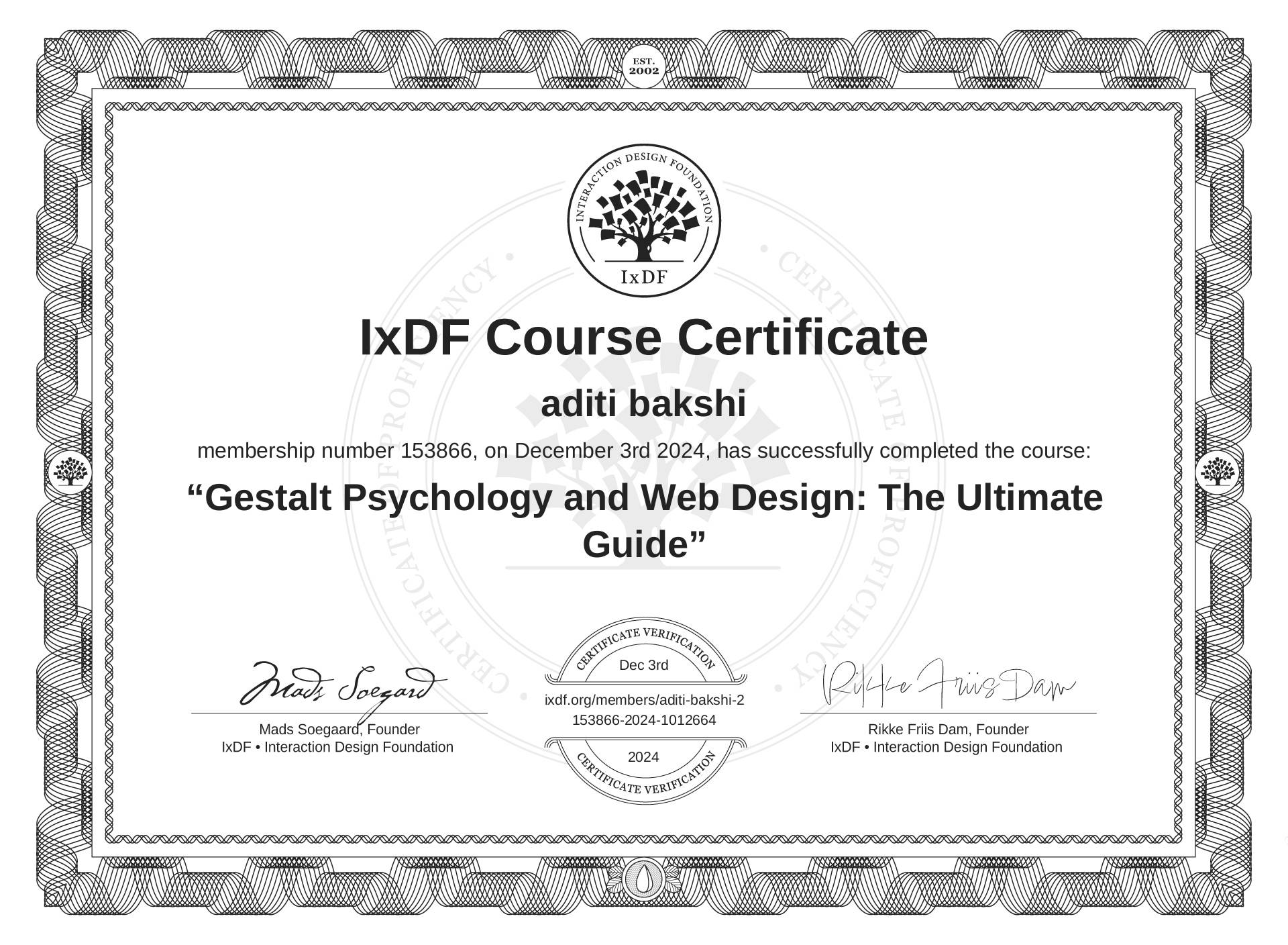IxDF Course Certificate awarded to aditi bakshi for completing the "Gestalt Psychology and Web Design: The Ultimate Guide" course