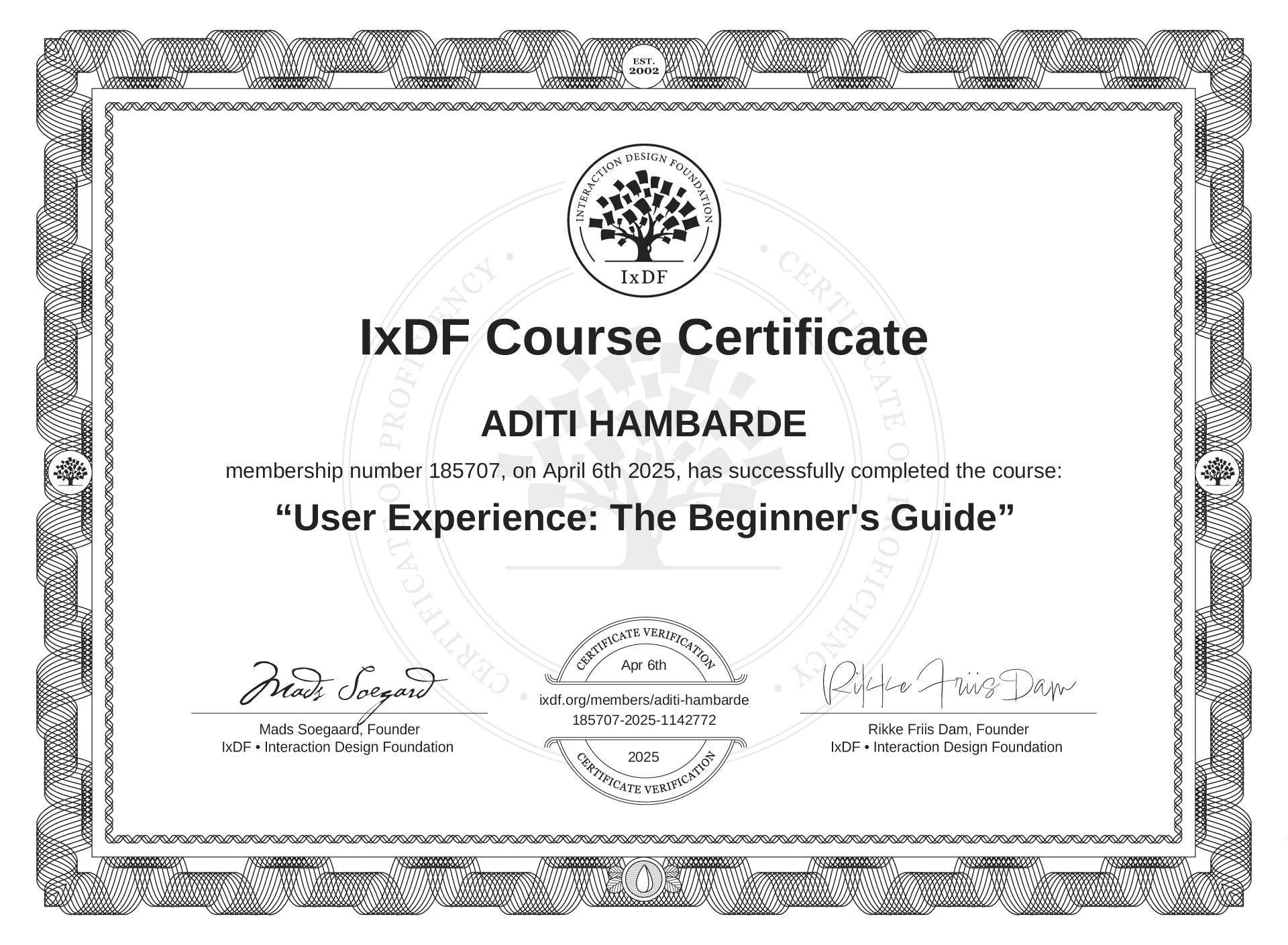 IxDF Course Certificates are awarded to ADITI HAMBARDE in formal recognition of their coursework surpassing the rigorous benchmarks of exceptional performance established by the IxDF Educational Codex.