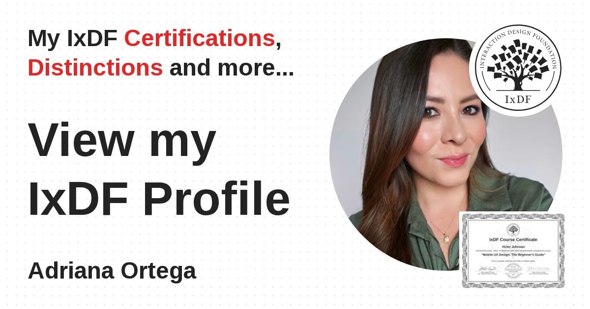 IxDF Course Certificates are awarded to Adriana Ortega in formal recognition of their coursework surpassing the rigorous benchmarks of exceptional performance established by the IxDF Educational Codex.