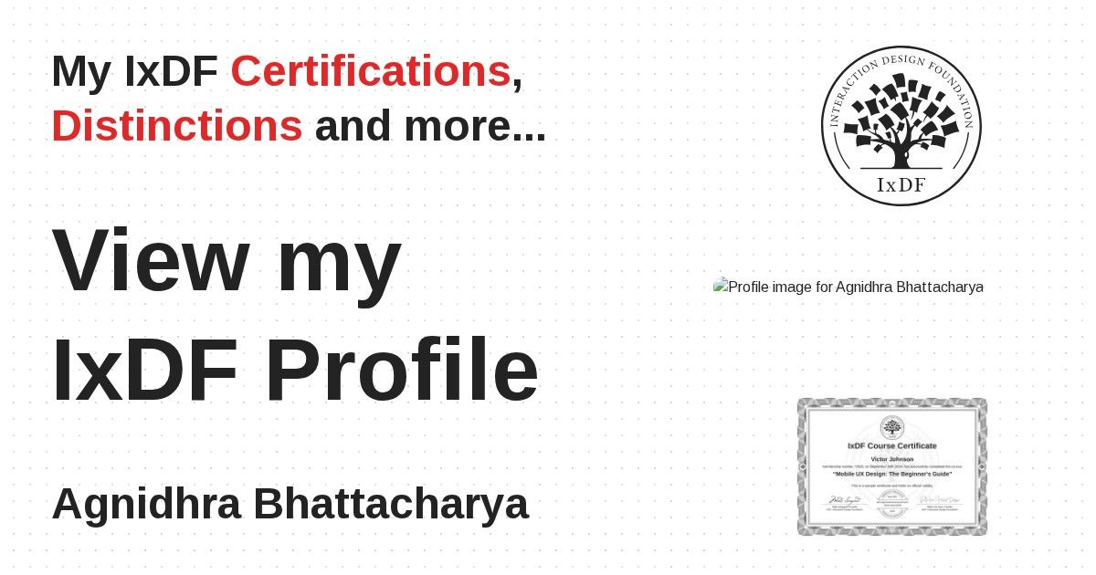 IxDF Course Certificates are awarded to Agnidhra Bhattacharya in formal recognition of their coursework surpassing the rigorous benchmarks of exceptional performance established by the IxDF Educational Codex.