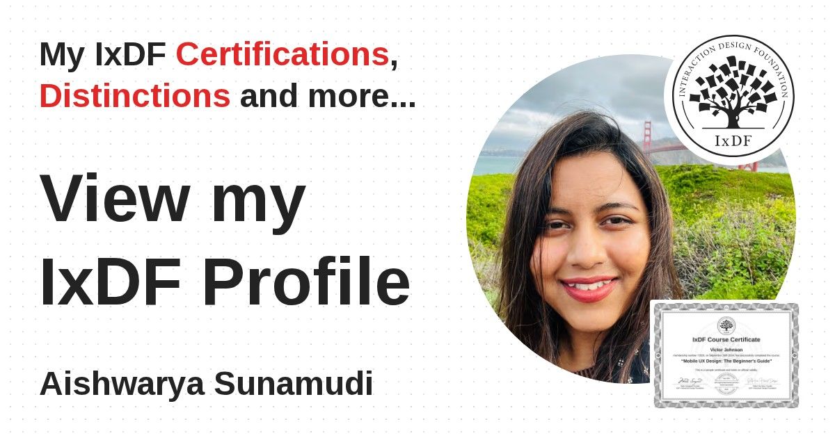 Distinctions are conferred upon Aishwarya Sunamudi in formal recognition of their notable achievements and contributions, as stipulated by the IxDF Educational Codex.