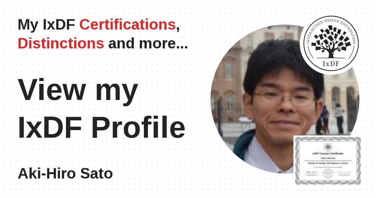 IxDF Course Certificates are awarded to Aki-Hiro Sato in formal recognition of their coursework surpassing the rigorous benchmarks of exceptional performance established by the IxDF Educational Codex.