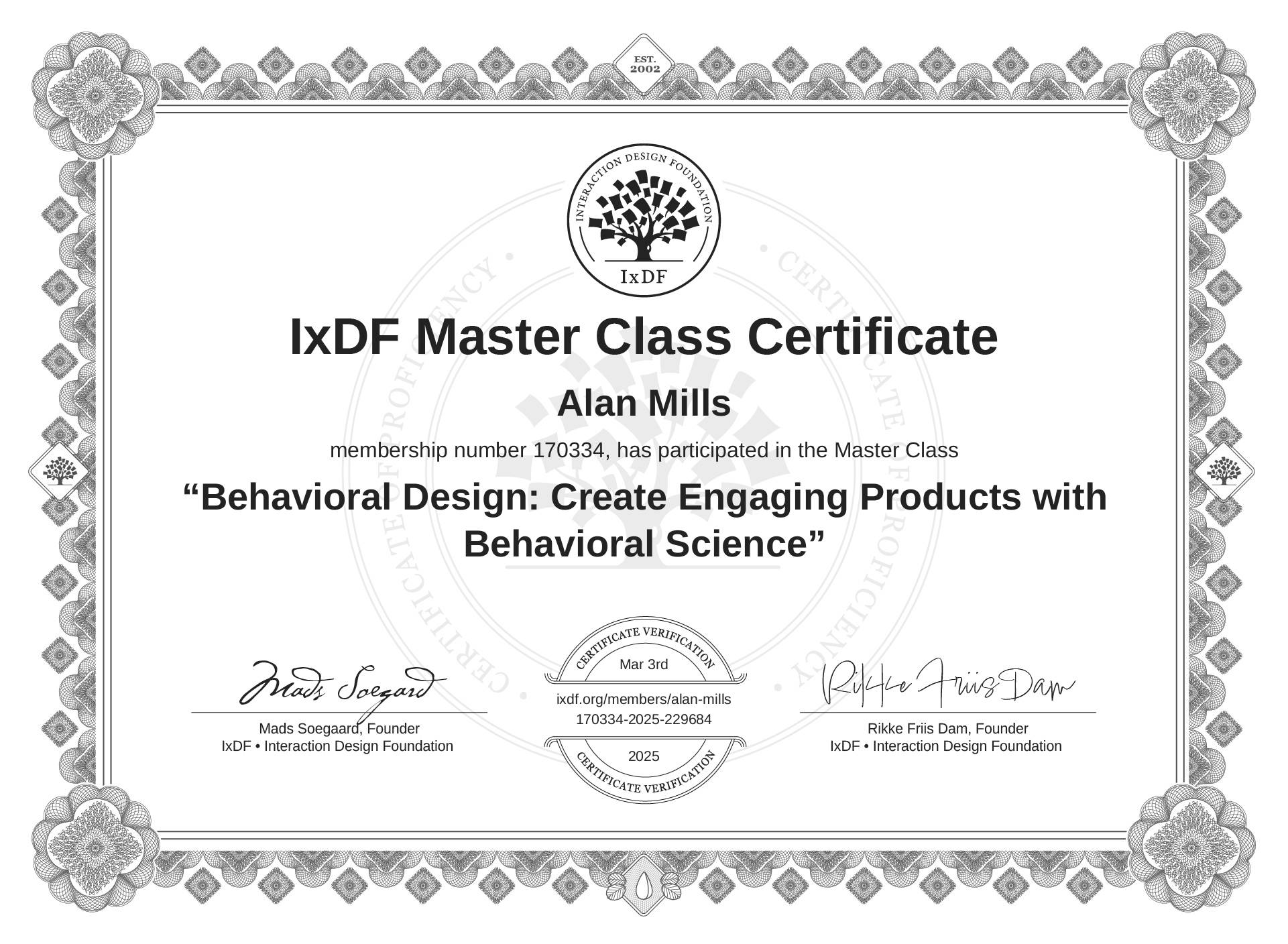 The IxDF Master Class Certificate (ID #mcc_c7daae15ecb94bf2aa301ffa2f01568f) above is awarded to Alan Mills in formal recognition of their participation in the Master Class Behavioral Design: Create Engaging Products with Behavioral Science .