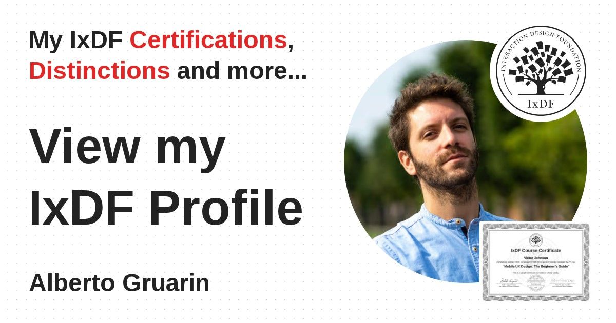 IxDF Course Certificates are awarded to Alberto Gruarin in formal recognition of their coursework surpassing the rigorous benchmarks of exceptional performance established by the IxDF Educational Codex.