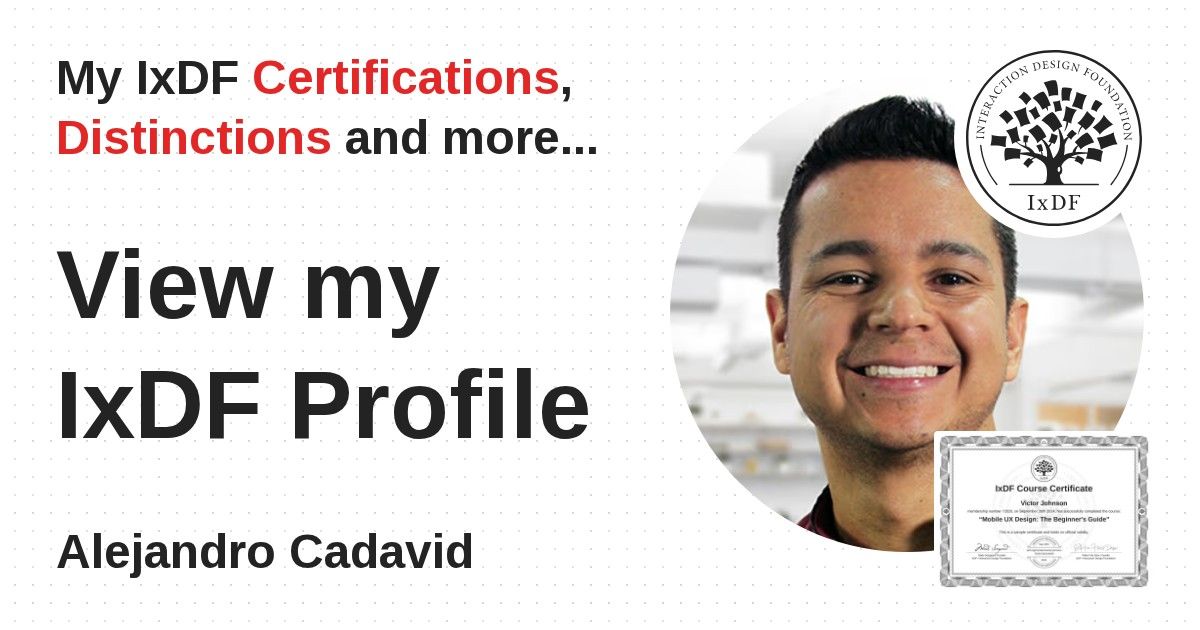 IxDF Course Certificates are awarded to Alejandro Cadavid in formal recognition of their coursework surpassing the rigorous benchmarks of exceptional performance established by the IxDF Educational Codex.