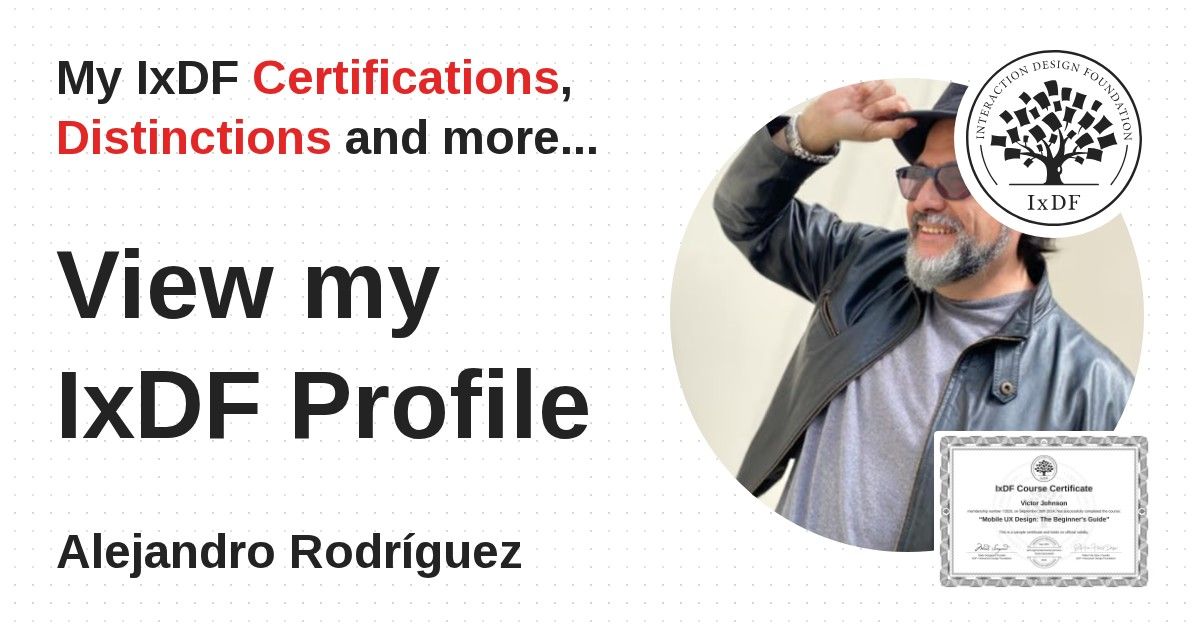 IxDF Course Certificates are awarded to Alejandro Rodríguez in formal recognition of their coursework surpassing the rigorous benchmarks of exceptional performance established by the IxDF Educational Codex.
