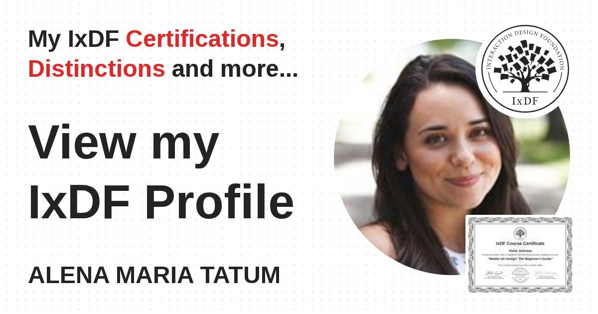 IxDF Course Certificates are awarded to ALENA MARIA TATUM in formal recognition of their coursework surpassing the rigorous benchmarks of exceptional performance established by the IxDF Educational Codex.
