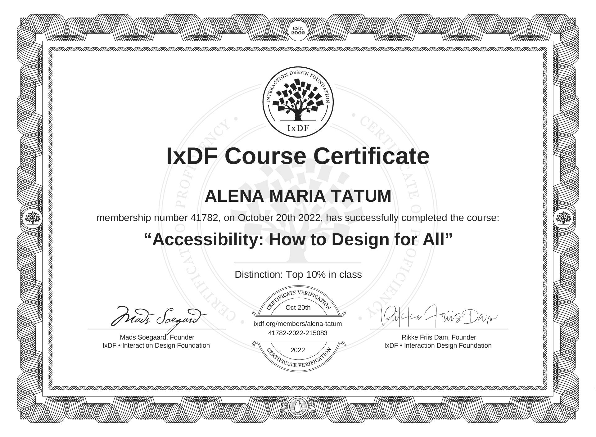 This IxDF Membership Certificate is issued to ALENA MARIA TATUM
