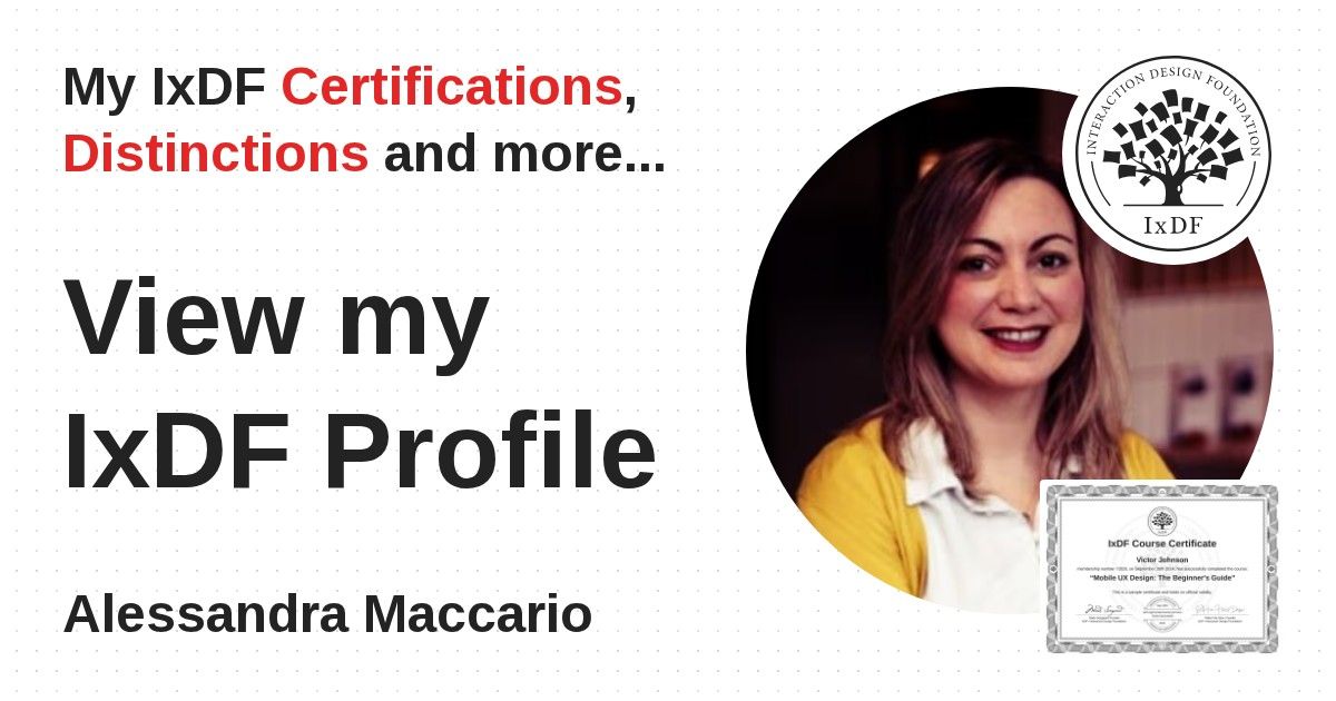 IxDF Course Certificates are awarded to Alessandra Maccario in formal recognition of their coursework surpassing the rigorous benchmarks of exceptional performance established by the IxDF Educational Codex.