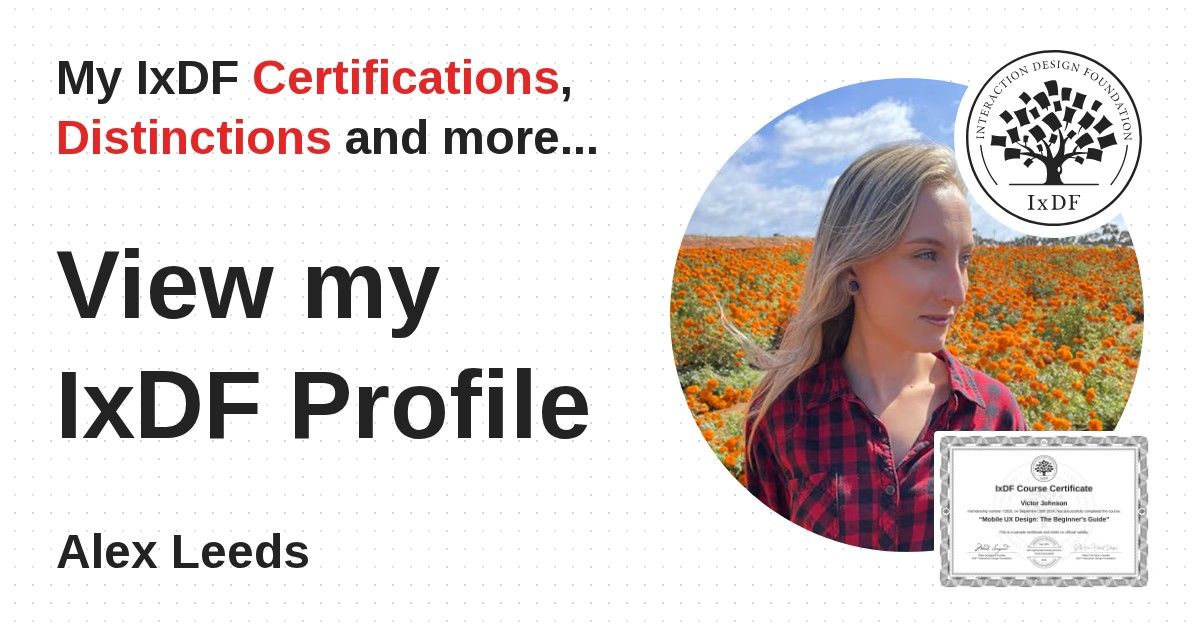 IxDF Course Certificates are awarded to Alex Leeds in formal recognition of their coursework surpassing the rigorous benchmarks of exceptional performance established by the IxDF Educational Codex.