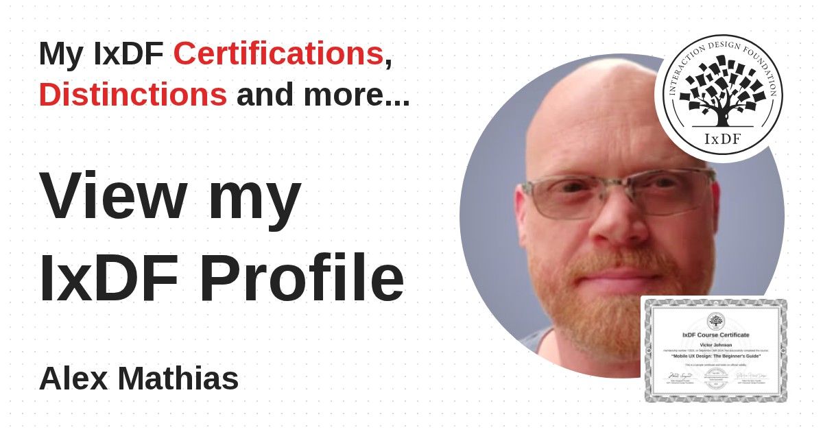 IxDF Course Certificates are awarded to Alex Mathias in formal recognition of their coursework surpassing the rigorous benchmarks of exceptional performance established by the IxDF Educational Codex.