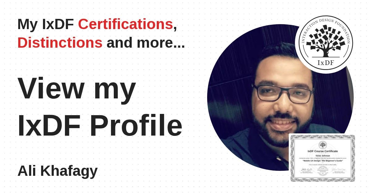 IxDF Course Certificates are awarded to Ali Khafagy in formal recognition of their coursework surpassing the rigorous benchmarks of exceptional performance established by the IxDF Educational Codex.