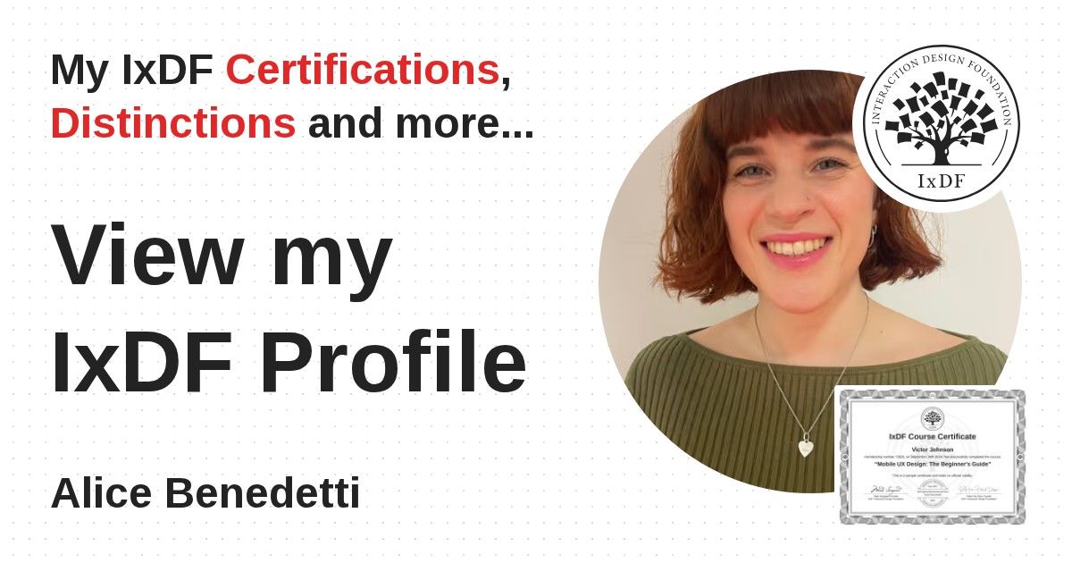 Distinctions are conferred upon Alice Benedetti in formal recognition of their notable achievements and contributions, as stipulated by the IxDF Educational Codex.