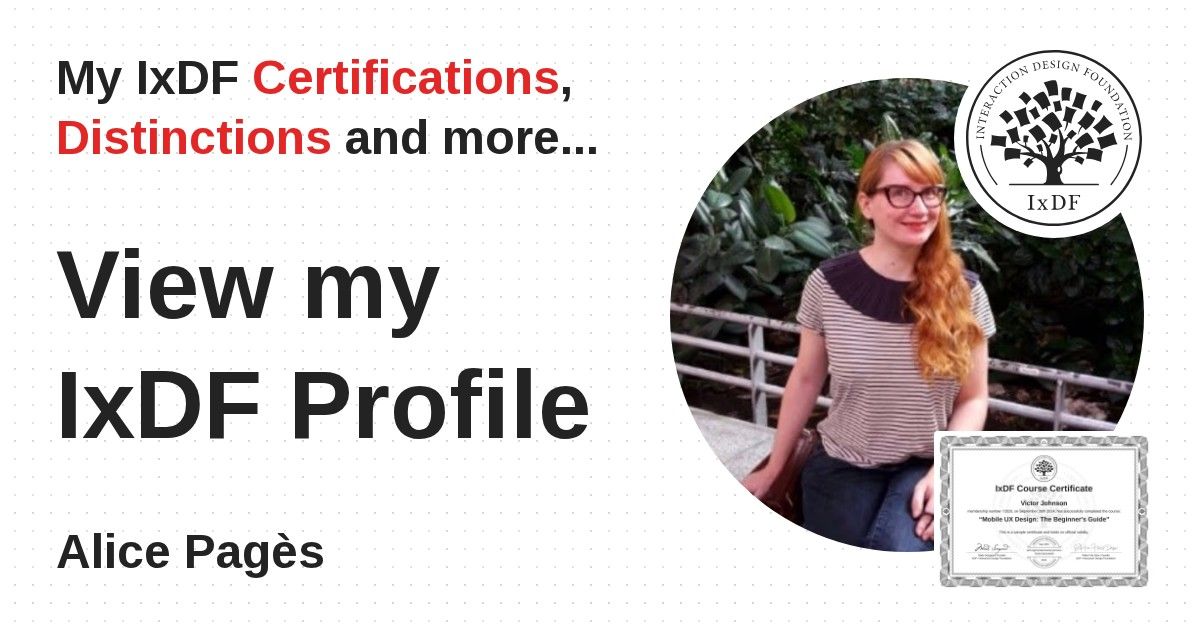 IxDF Course Certificates are awarded to Alice Pagès in formal recognition of their coursework surpassing the rigorous benchmarks of exceptional performance established by the IxDF Educational Codex.