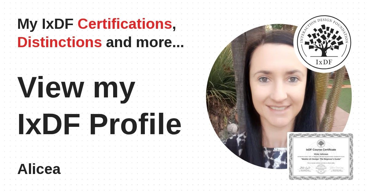 IxDF Course Certificates are awarded to Alicea in formal recognition of their coursework surpassing the rigorous benchmarks of exceptional performance established by the IxDF Educational Codex.