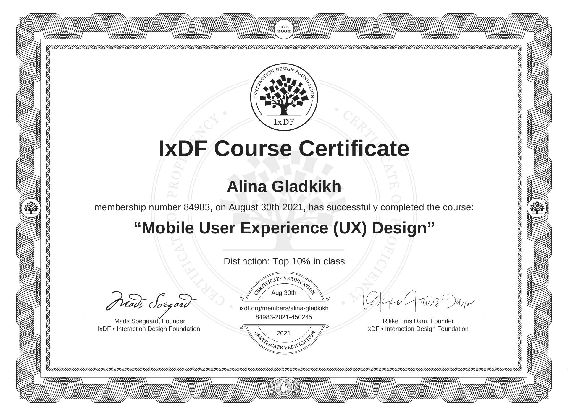 The IxDF Course Certificate (ID #f8f8fe83-b9fb-4821-b7cc-c787e97b8a92) above is awarded to Alina Gladkikh with a Top 10% Distinction in formal recognition of their coursework surpassing the rigorous benchmarks of exceptional performance established by the IxDF Educational Codex. View Course Curriculum.