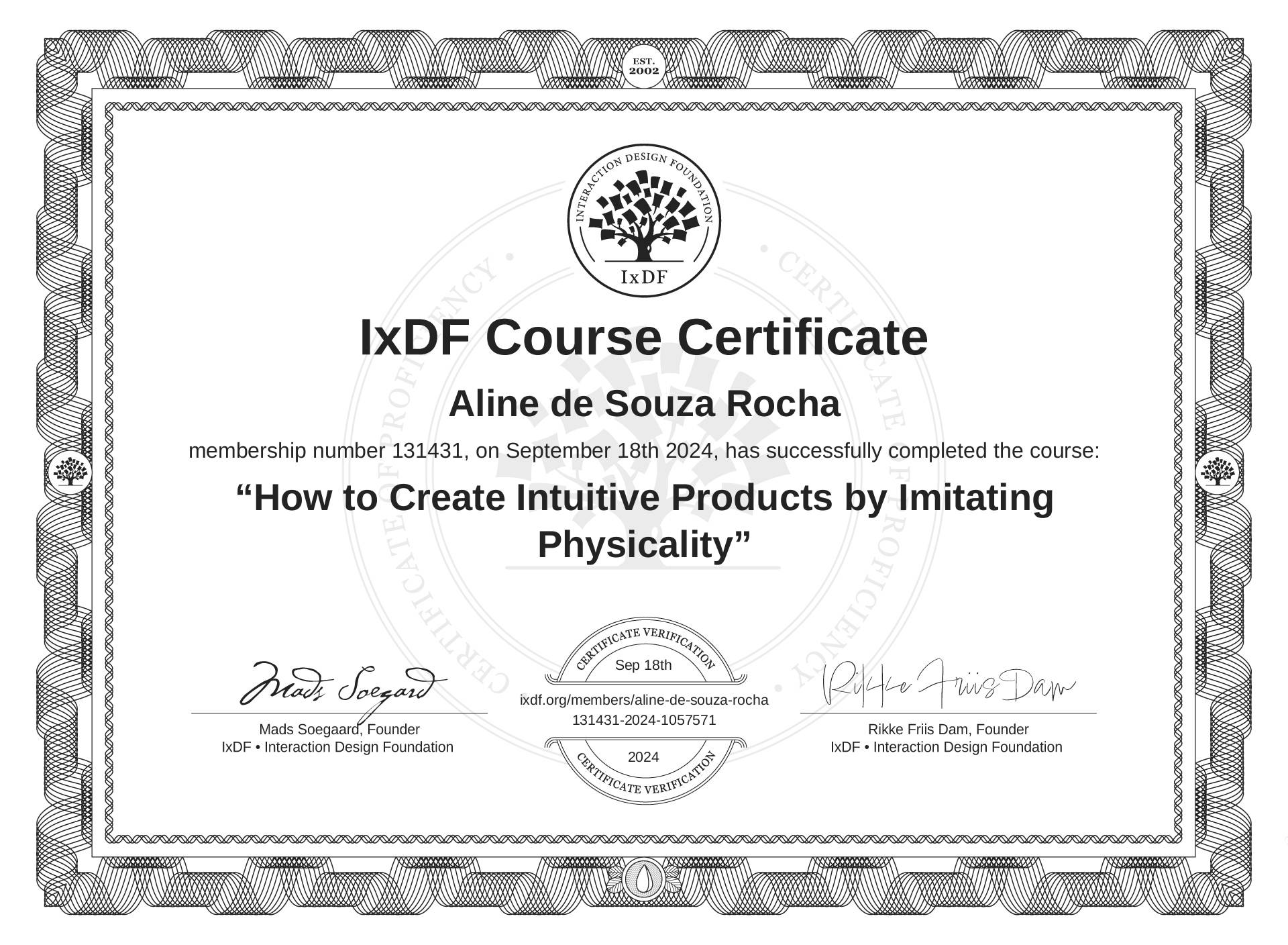 The IxDF Course Certificate (ID #d5d09a39-a397-4890-aa42-bc6f7f2e9be9) above is awarded to Aline de Souza Rocha in formal recognition of their coursework surpassing the rigorous benchmarks of exceptional performance established by the IxDF Educational Codex. View Course Curriculum.